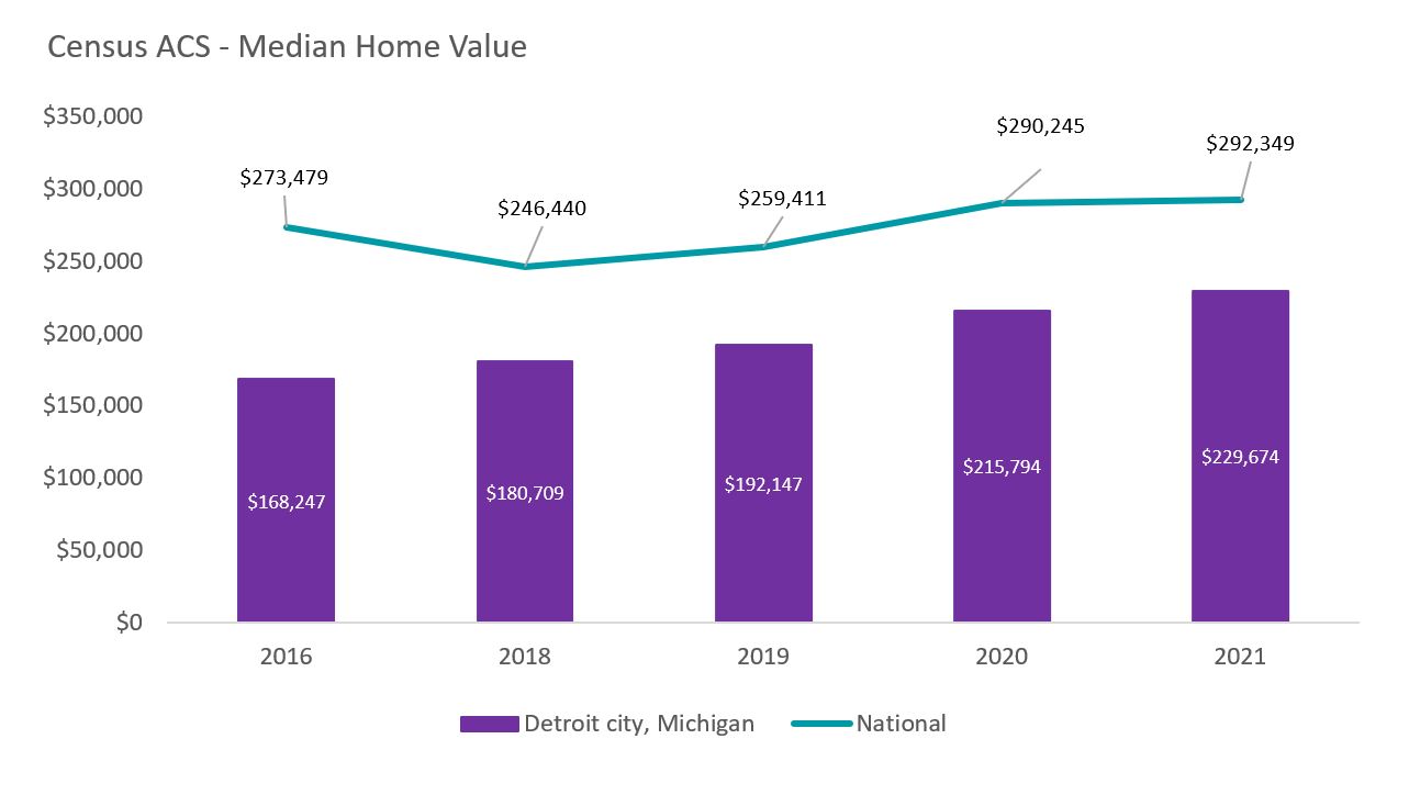 O valor médio de uma residência, em setembro de 2021, foi de USD 85.000, em comparação com os USD 800.000, em Nova York, e os USD 1.200.000 em Los Angeles. Isso permite que mais pessoas em Detroit comprem uma casa, já que as taxas de propriedade imobiliária em Detroit são de 52% em comparação com cerca de 45% em Los Angeles e 33% em Nova York. Com um aluguel médio mensal de USD 1.200 por mês e uma taxa de disponibilidade de aluguel de 5,9%, Detroit oferece um dos mercados de aluguel mais atraentes do país, proporcionando uma excelente oportunidade para investidores que buscam rendimentos por aluguel.